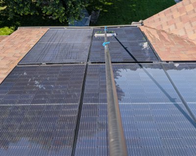 Dirty solar panels can lose 15-25% of their energy production. We use purified water and gentle, panel-safe brushes—never high pressure that could damage photovoltaic cells. Our systematic approach removes all debris, pollen, and residue, then rinses with deionized water to prevent mineral deposits. The result is restored efficiency and maximum return on your solar investment.